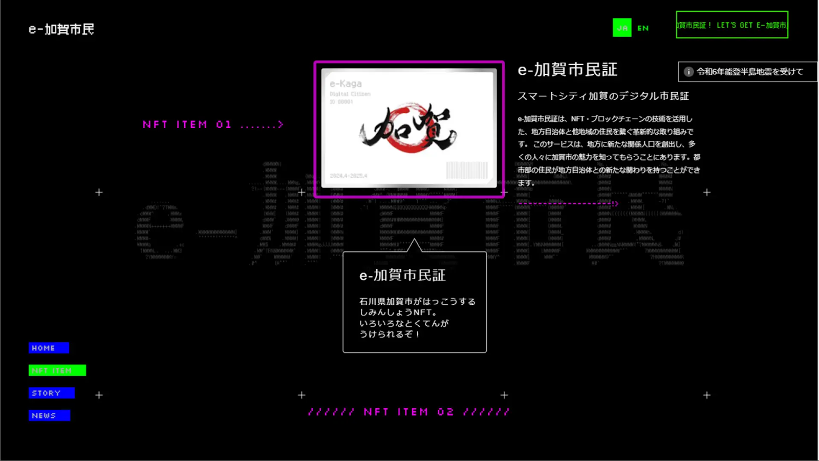 令和5年デジタル田園都市国家構想推進交付金「デジタル実装タイプ」マイナンバーカード利用横展開事例創出型の採択事業として、加賀市がNFTを活用した関係人口の創出を目指して提供する「e-加賀市民証NFT」は、マイナンバーカードを用いた公的個人認証によるWeb3ウォレット管理機能を付帯したものです。